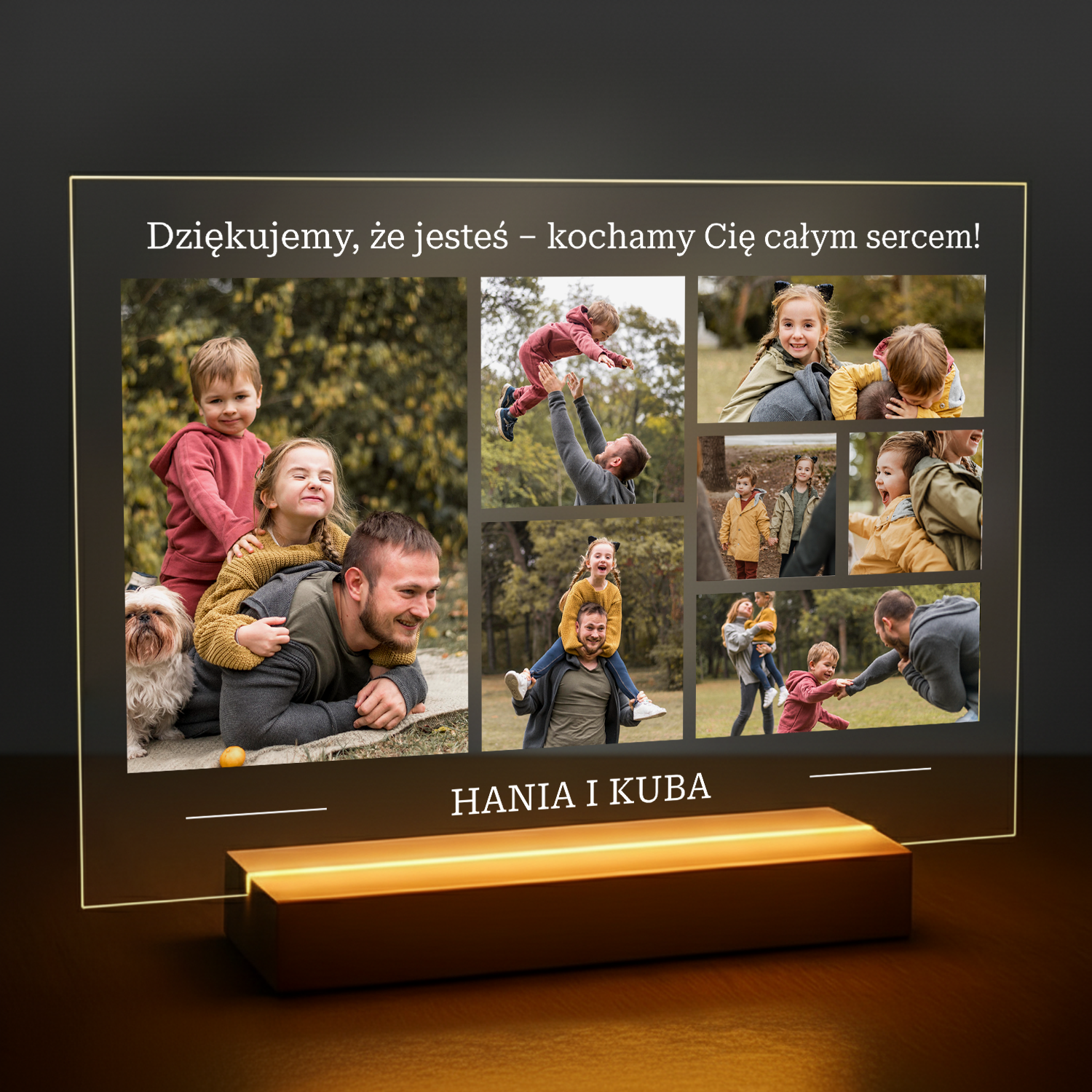 Stwórz sobistą historię pełna emocji i wspólnych przygód, przedstawioną w eleganckiej formie szkła akrylowego. Wystarczy wybrać swoje ulubione fotografie, a my stworzymy kolaż, który zachwyci Twojego tatę!