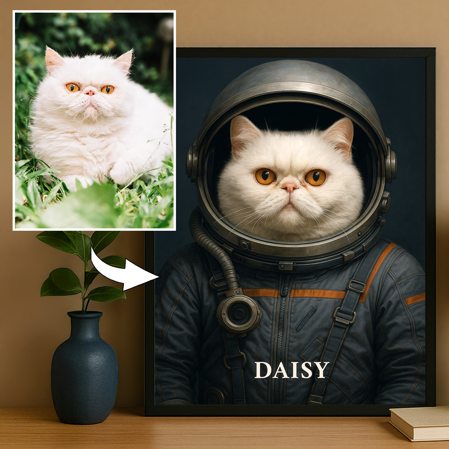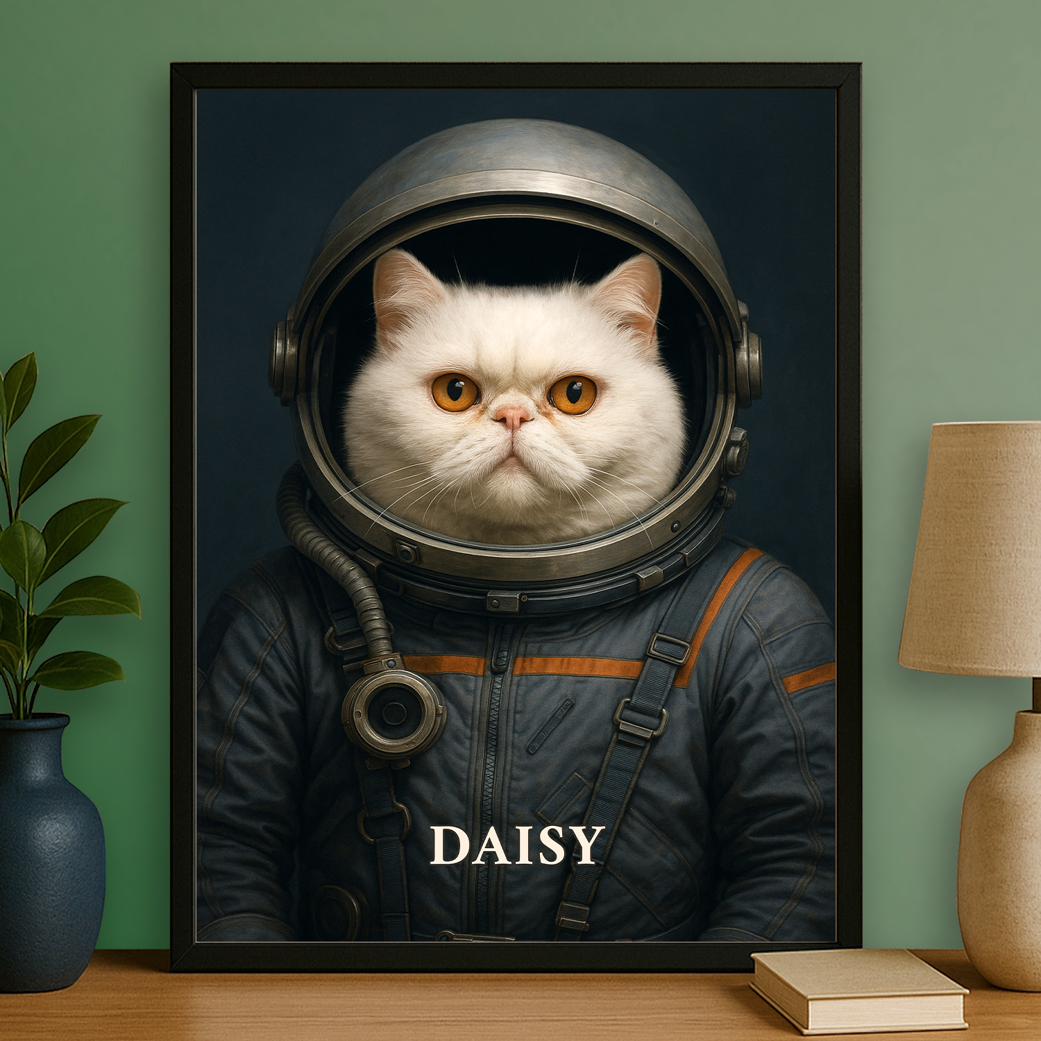 Szukasz prezentu, który zaskoczy i zachwyci miłośnika kotów? Ten personalizowany plakat z kotem w roli astronauty to połączenie humoru, emocji i wyjątkowej pamiątki. Wystarczy przesłać zdjęcie pupila, a my przemienimy go w bohatera kosmicznej misji, którego portret będzie ozdobą każdego wnętrza.