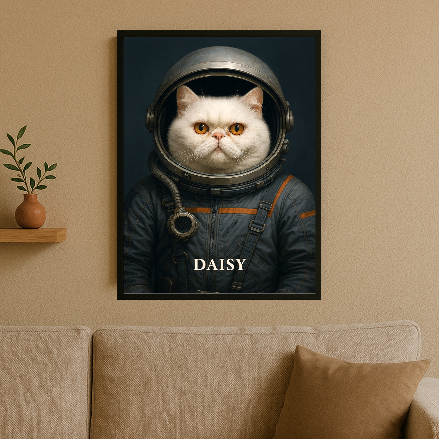 Personalizowany plakat z kotem w kosmicznej odsłonie to idealne połączenie humoru, unikalności i miłości do pupila!