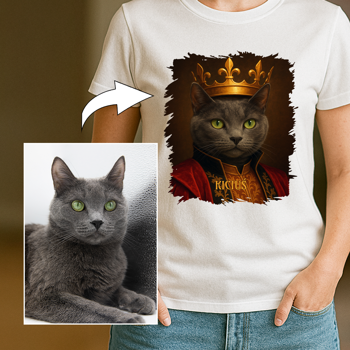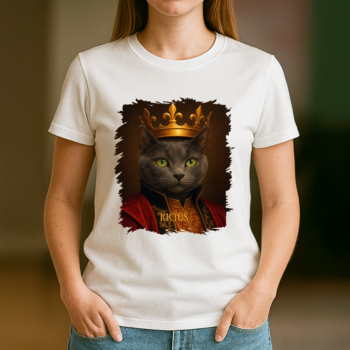 Teraz możesz to pokazać światu dzięki personalizowanej koszulce z portretem Twojego kota w królewskim wydaniu!