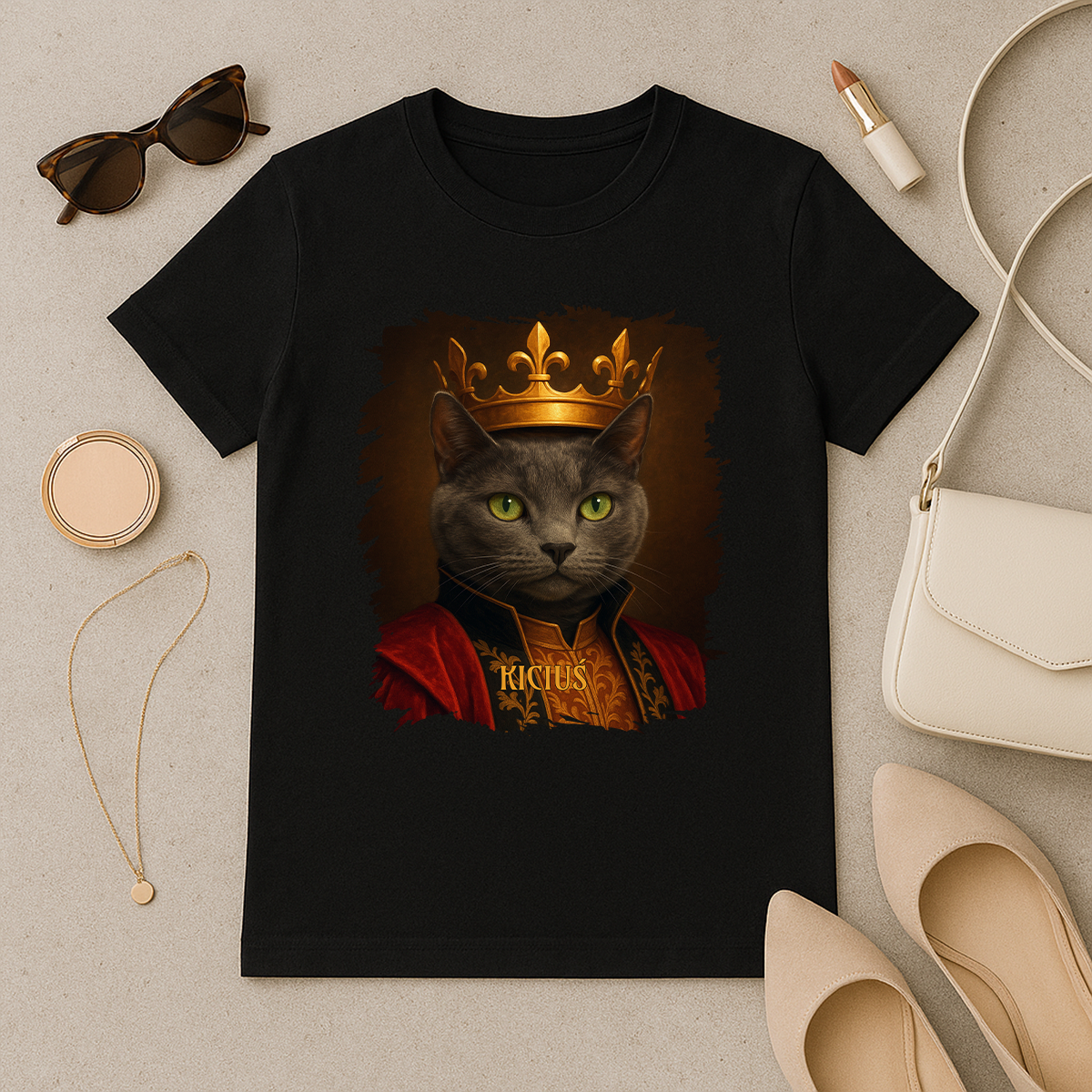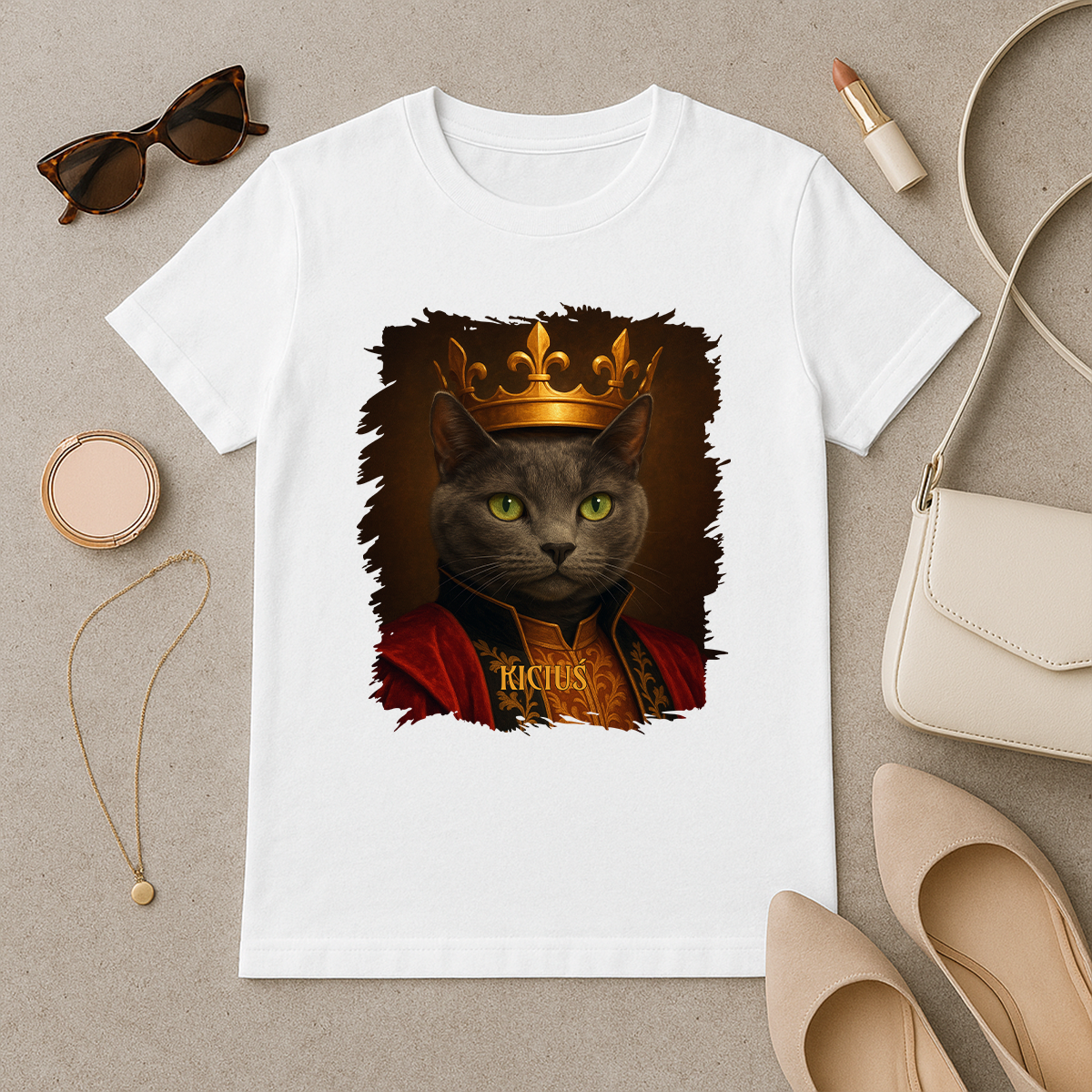 Prześlij zdjęcie swojego mruczka, a my zamienimy go w majestatycznego władcę w złotej koronie i królewskich szatach. Portret wygląda jak namalowany pędzlem – dopracowany w każdym szczególe i przeniesiony na miękki, wygodny t-shirt damski, idealny na prezent dla miłośniczki kotów.